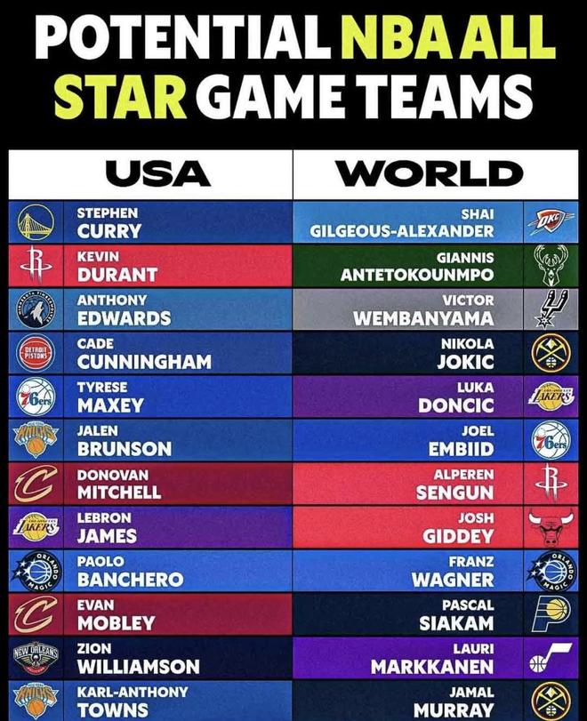 最近NBA官方宣布,从2026年开始全明星赛将启用全新的“美国对世界”赛制,两支美国队加一支世界队打迷你循环赛。 很快,篮球媒体也做出了这张“潜在全明星阵容”示意图,把库里、杜兰特、爱德华兹和亚历山大、阿德托昆博、东契奇、约基奇等人分成美国队和世界队放在一起。