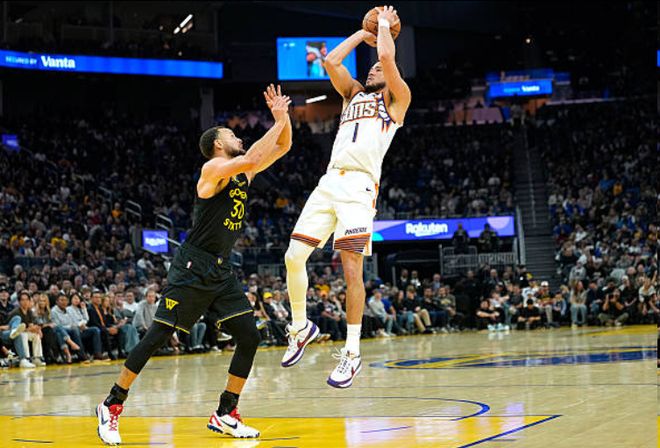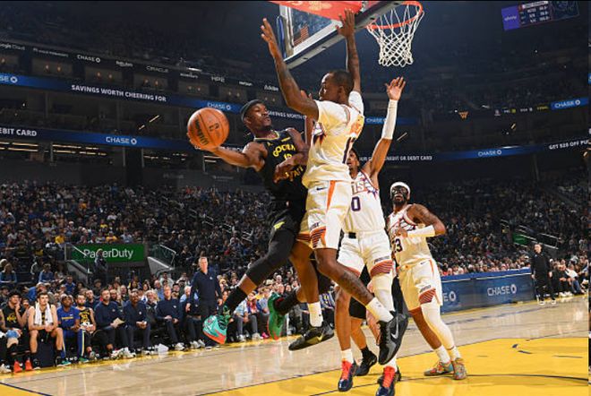 下半场,勇士加强了防守,在第三节,球队只让对手得到20分,勇士则是得到29分。虽然太阳在前三节落后6分,但是,他们仍然与勇士鏖战到最后一刻。不过,在最后1分40秒的时候,库里外线三分命中,勇士将比分拉开到7分。随后,太阳打出一波5-0小高潮,球队110-112落后勇士。